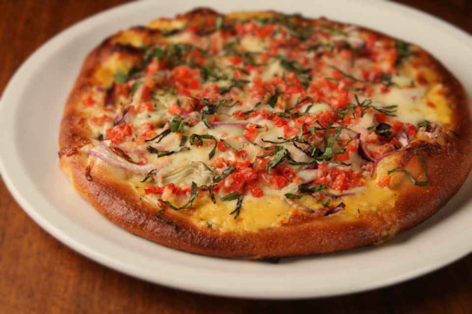 Red pepper, artichoke hearts, spinach, basil, red onion, garlic, salsa fresca, Alfredo cheese sauce, mozzarella and parmesan cheese.