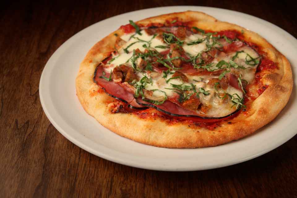 Chorizo sausage, prosciutto, ham, tomato basil sauce, bocconcini cheese, basil.